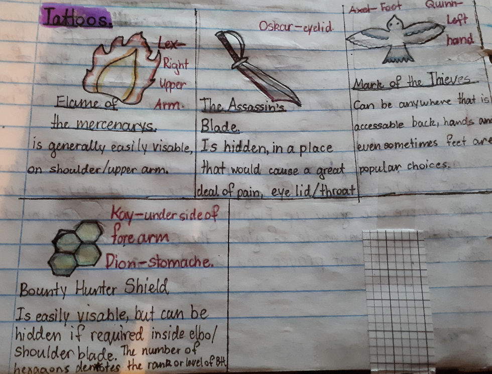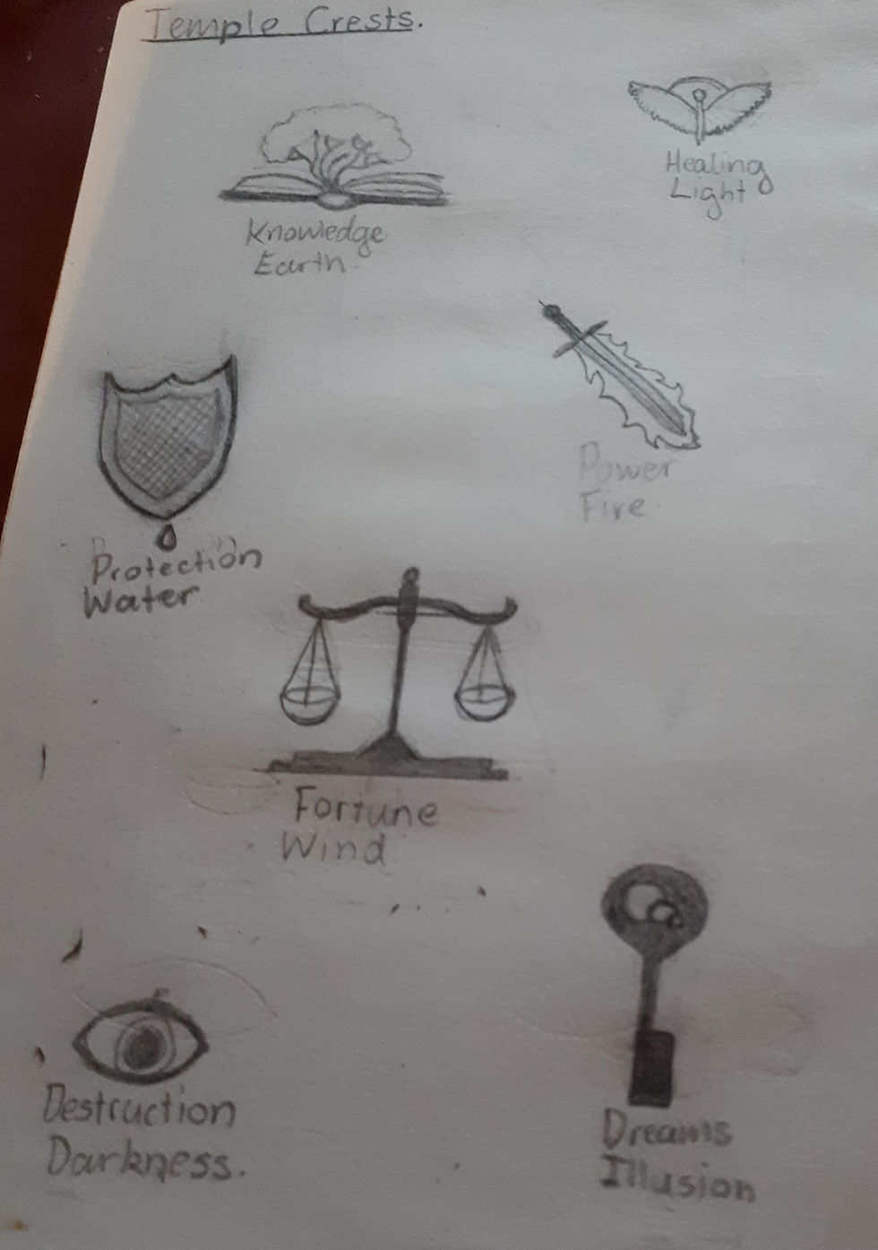 That's all for now. I will leave you with some of my (old, really old) Neweth Sketches. Remember I can't draw. The first is an early and very rough map of Neweth, next are the symbols of the different temples (even those that are unofficial), examples of the guild membership tattoos, and finally an initial design of the Temple of Knowledge entrance way.